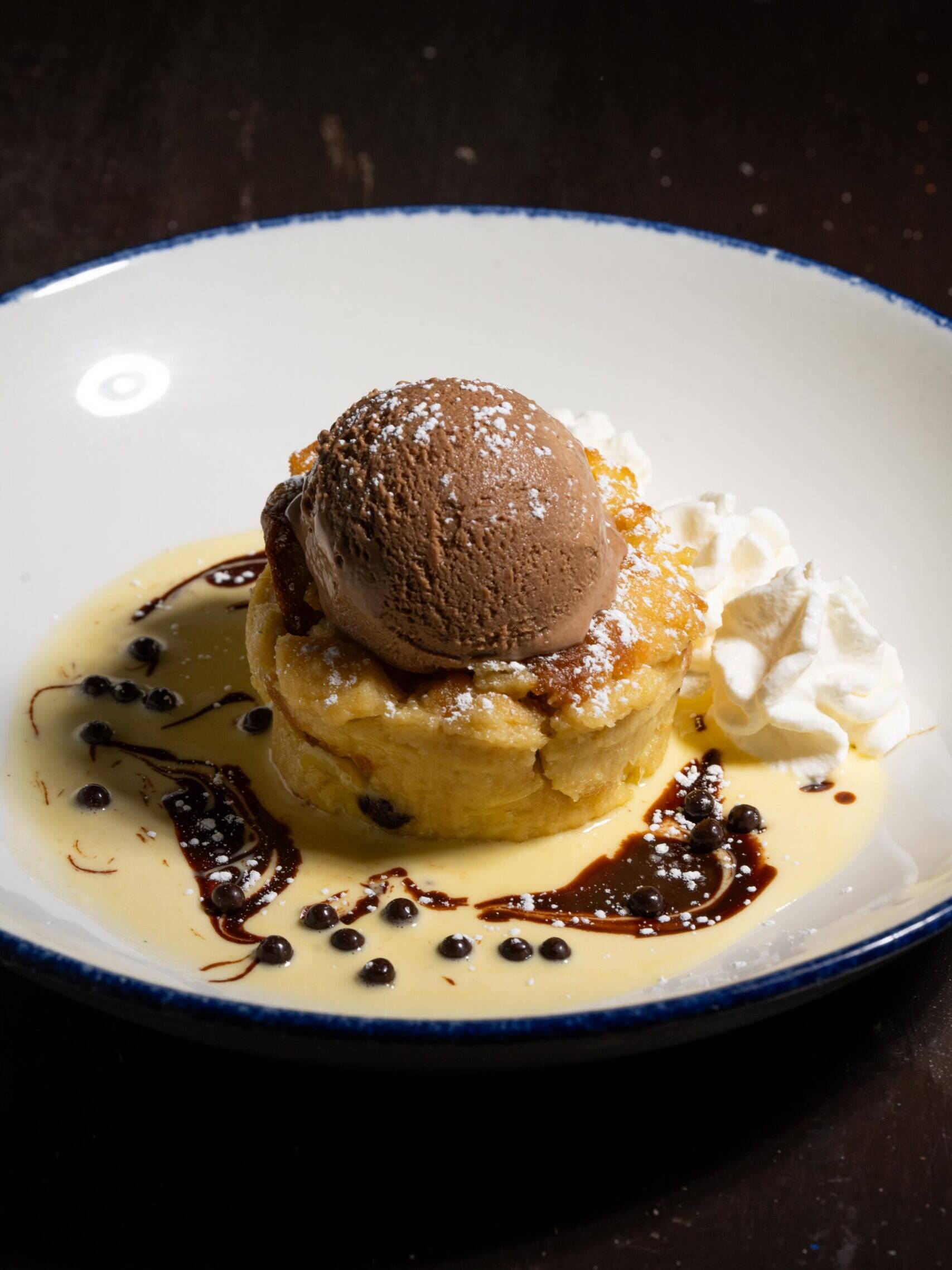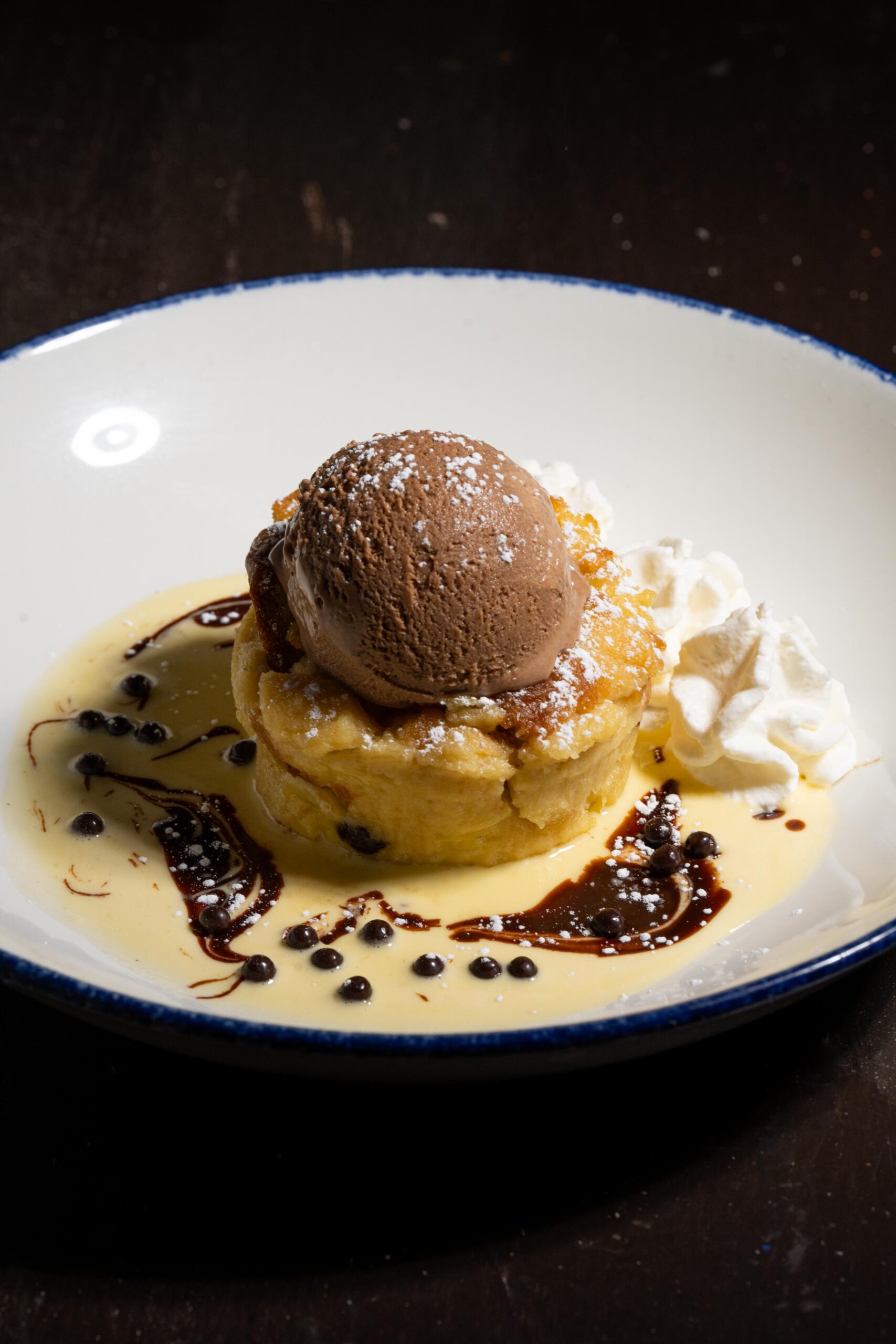 Brioche, Raisins, Pine Nuts, Créme Anglaise, Chocolate Chips, Hazelnut Gelato